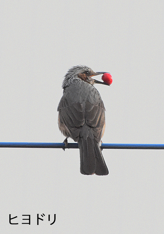 「ヒヨドリ」は赤い食べ物?を咥えていました。