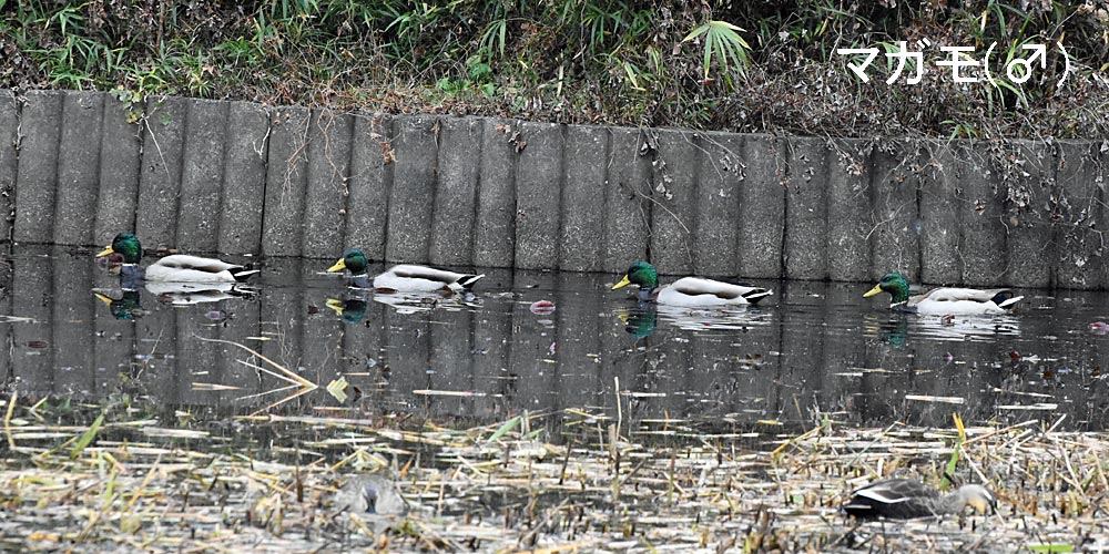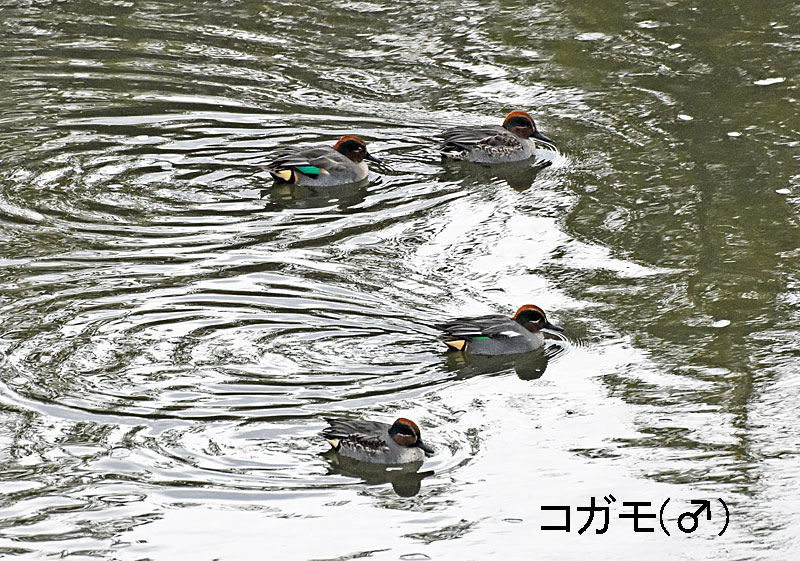 マガモ,カルガモ,コガモ,カイツブリ,キジバト,アオサギ